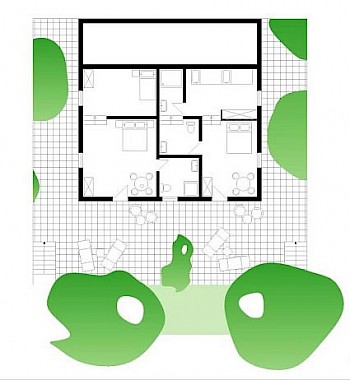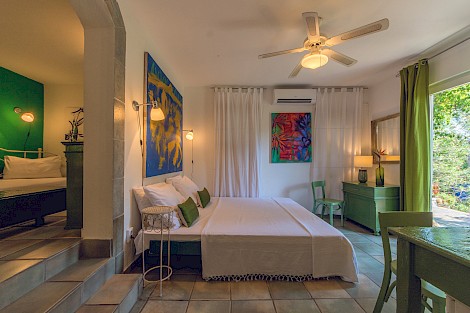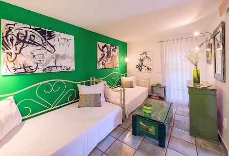 (2 guests + 2 extra beds) Family Bungalow consists of 1 bedroom with a Queen-size bed and an additional room with 2 single beds, both with access to the bathroom. Private entrance. Ideal for a family with small children.